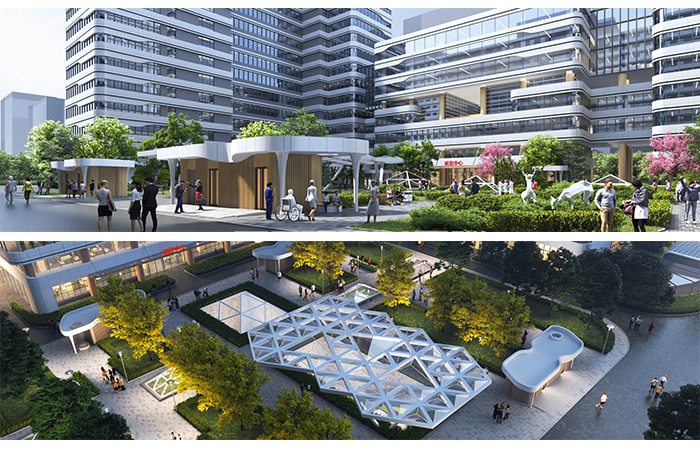 方案從平安醫(yī)院的LOGO展翅的鴿子形象中提取雙翅元素,沿建通街西立面植入兩條雙翅曲線,象征著愛與希望。南立面純凈的白色水平線條相互穿插、底層設(shè)置架空,科研樓中部設(shè)置南北通透的空中花園,同時引入垂直綠化,使整個建筑給人以平靜祥和的心理感受。