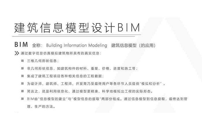 BIM由“信息模型的建立”與“模型信息的提取”兩部分組成。通過(guò)信息模型到信息提取,最終達(dá)到管理、生產(chǎn)的方法。